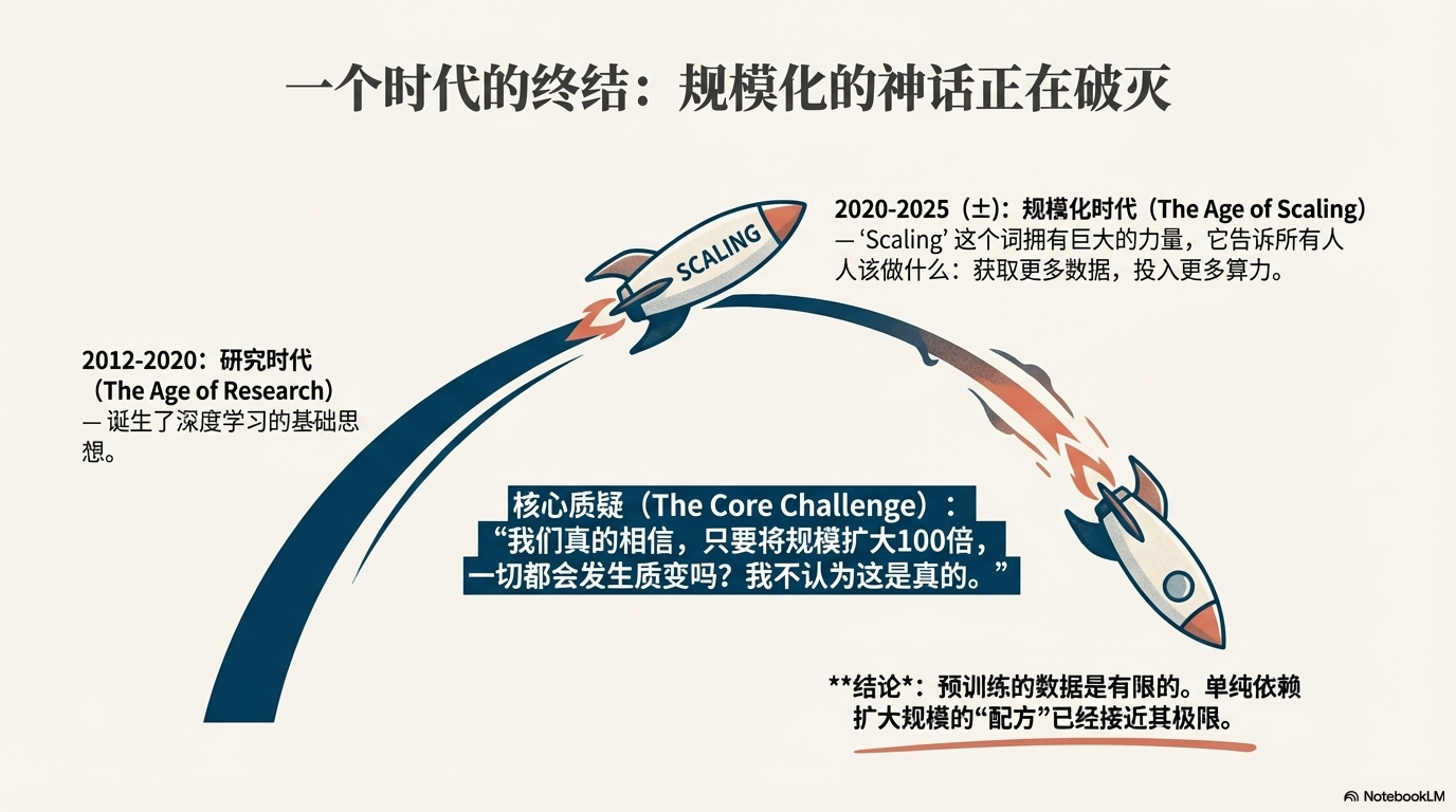 Sutskever 的核心论题是:“规模化时代”(大致为 2020–2025)遵循的“预训练 + 大规模模型 + 单次训练 ”套路已经走到尽头。