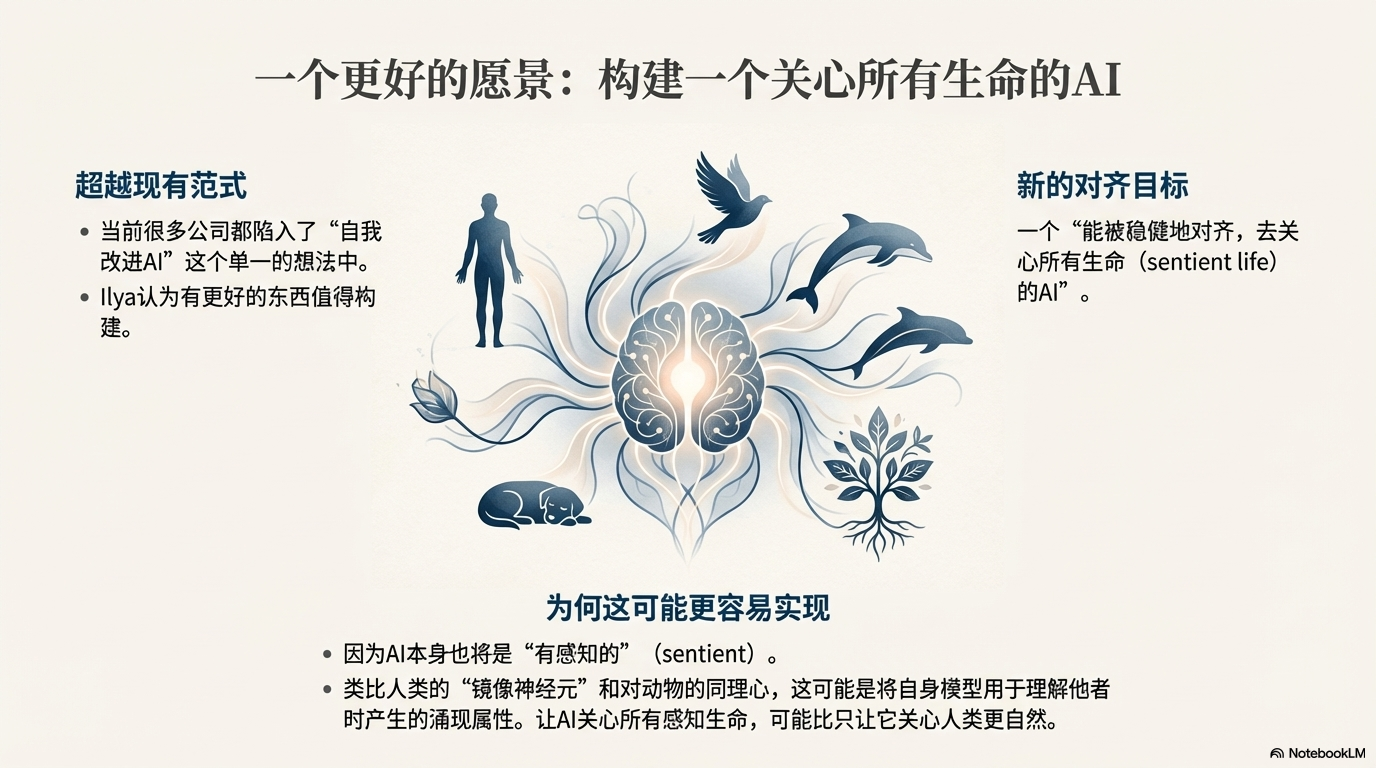 SSI 追求的是一种类似于人类镜像神经元和同理心的机制,让 AI 从底层原理上理解并“关心”感知生命(Sentient Life),就像人类在演化中学会关心社会关系一样。
