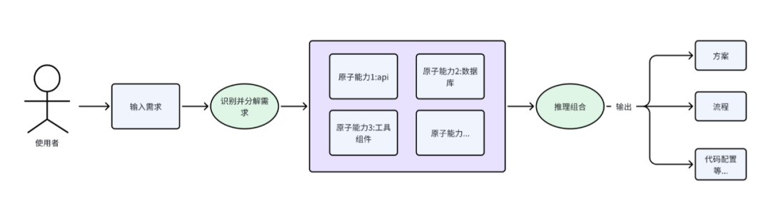 传统中台,对于使用者来说,需要不小的成本来理解应用这些原子能力,当能力不足,或许要走不少流程来完善自己的需求。