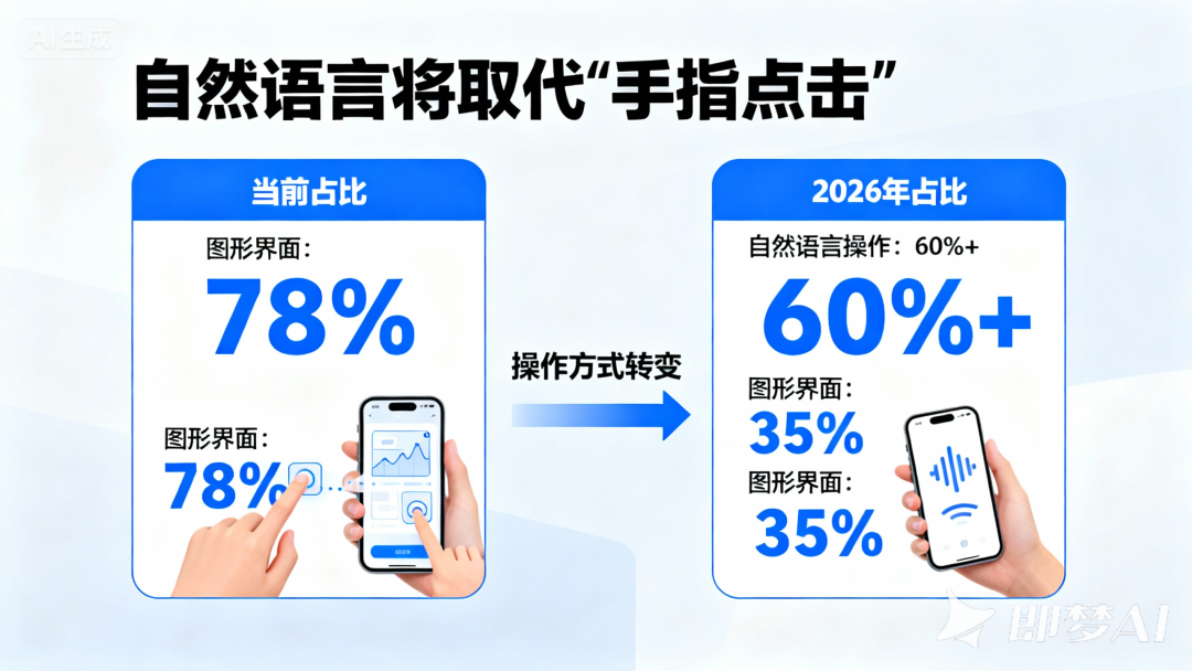 中国工程院院士邬贺铨的判断更具体:2026年,超过60%的手机操作将通过说话完成,现在占比78%的图形界面,会骤降到35%。