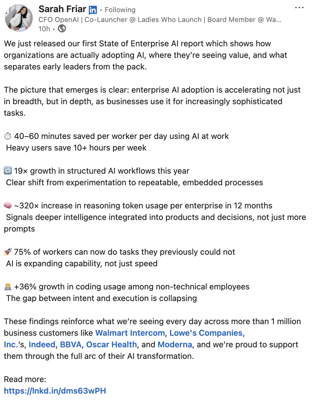 在这样的背景下,OpenAI发布了《企业AI现状报告》,公布其在企业AI上真正的实力。