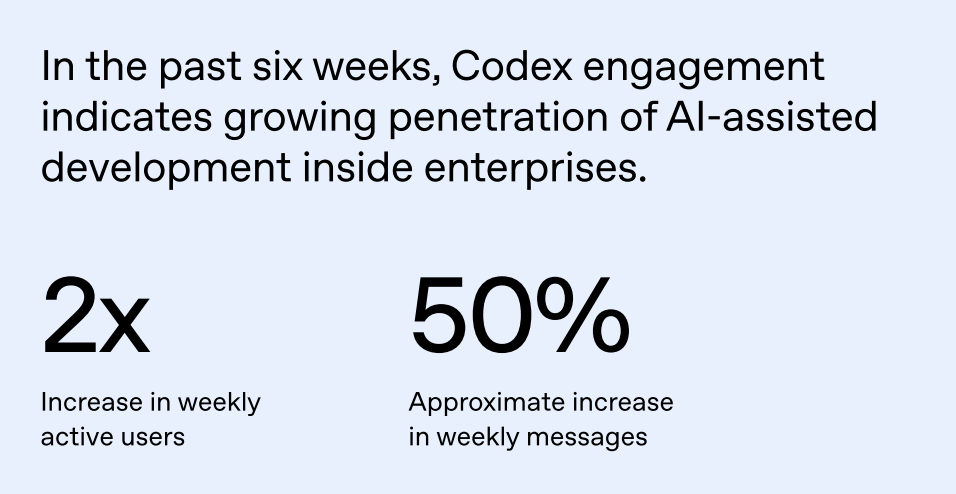 Codex(代码模型)的周活跃用户增长了2倍,显示代码生成数据的增加。