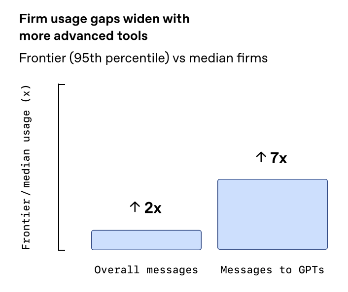 在企业层面,头部企业(Frontier firms)每席位的消息量是中位数企业的2倍,且发送给Custom GPTs(代表标准化工作流)的消息量是中位数企业的7倍。