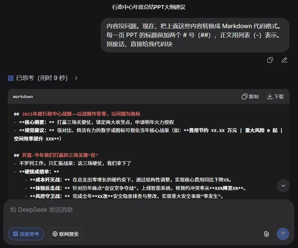 这一步最关键!很多人卡在这,不知道怎么把文字变成 PPT。你要让 DeepSeek 给一段“机器能读懂的暗号”,这叫 Markdown。
