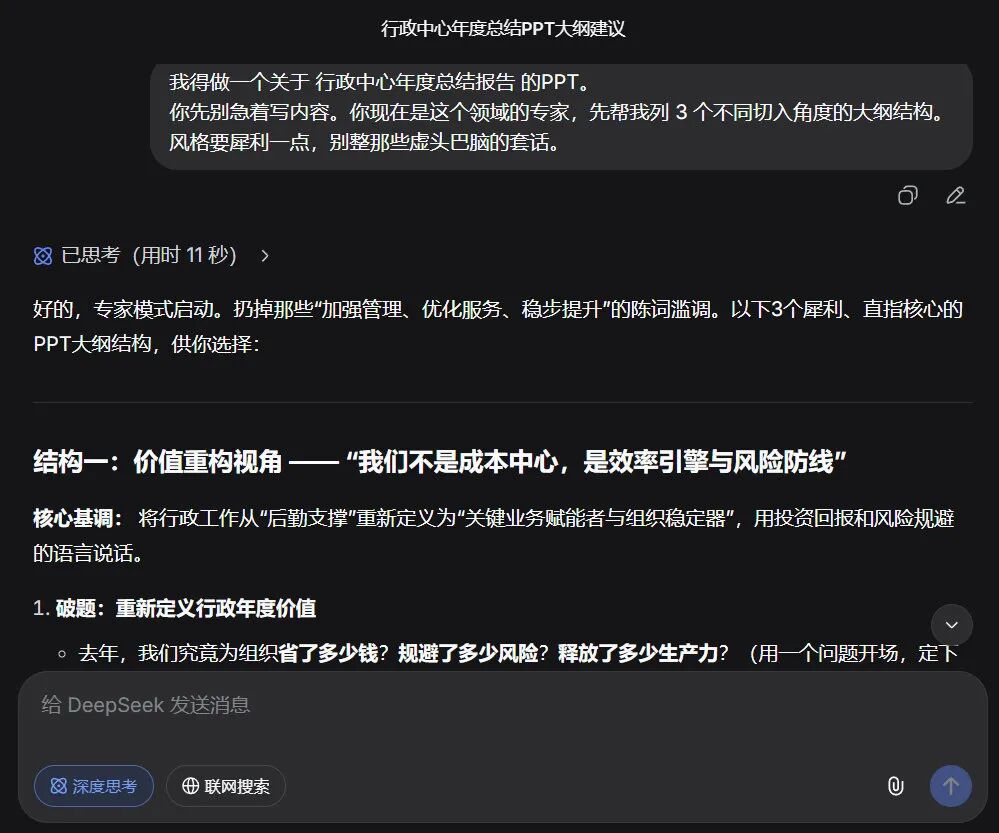这时候,它可能会给你“数据导向型”、“问题解决型”、“故事叙述型”三个大纲。你挑一个你觉得靠谱的。