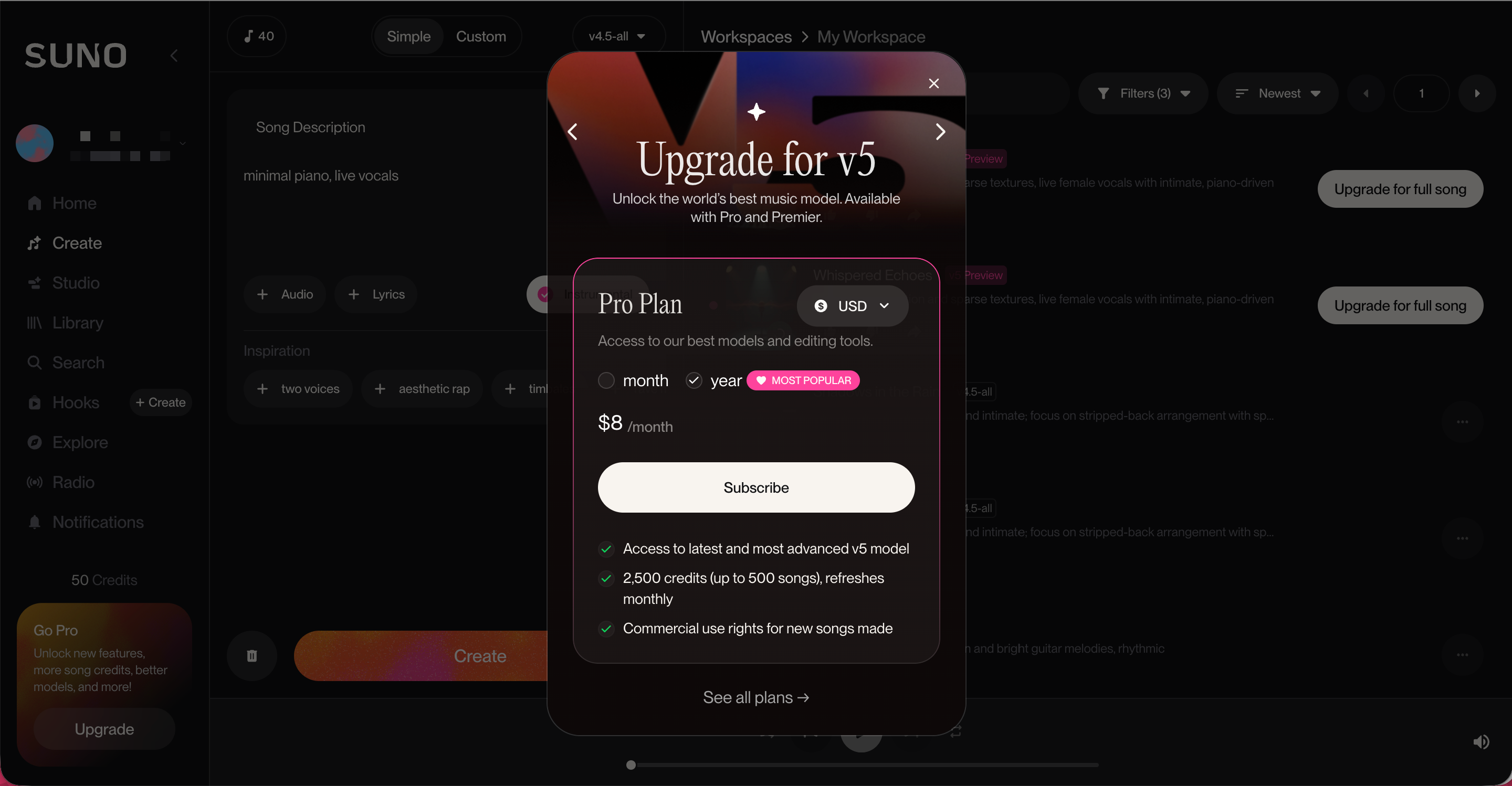 例如在QQ音乐、酷狗音乐,用户最低支付10元可获得2首AI歌曲,相当于每首歌的制作成本为5元。而在Suno平台,除了免费使用的模型外,专业版包年会员的单月价格为每月8美元,至多可以生成500首歌曲,相当于每生成一首歌只需要支付0.016美元(0.11元人民币)。
