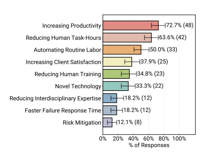其他的动机也非常务实:63.6%是为了减少人工工时,50% 是为了自动化常规劳动。