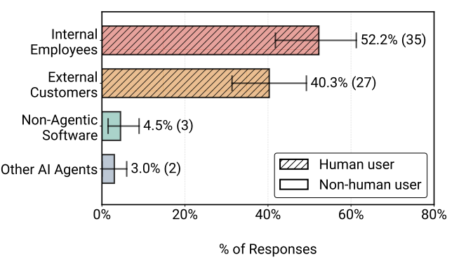 92.5%的Agent 直接服务于人类用户,其中52.2%是服务于企业内部员工 。