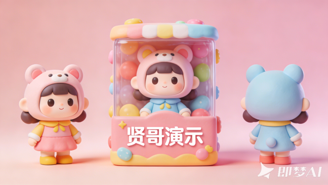 复制这段提示词:IP盲盒风格,C4D渲染,超萌的3D粘土质感,(text: “贤哥演示”),柔和的演播室灯光,纯色背景,高细节,4K分辨率,糖果配色,可爱,治愈。