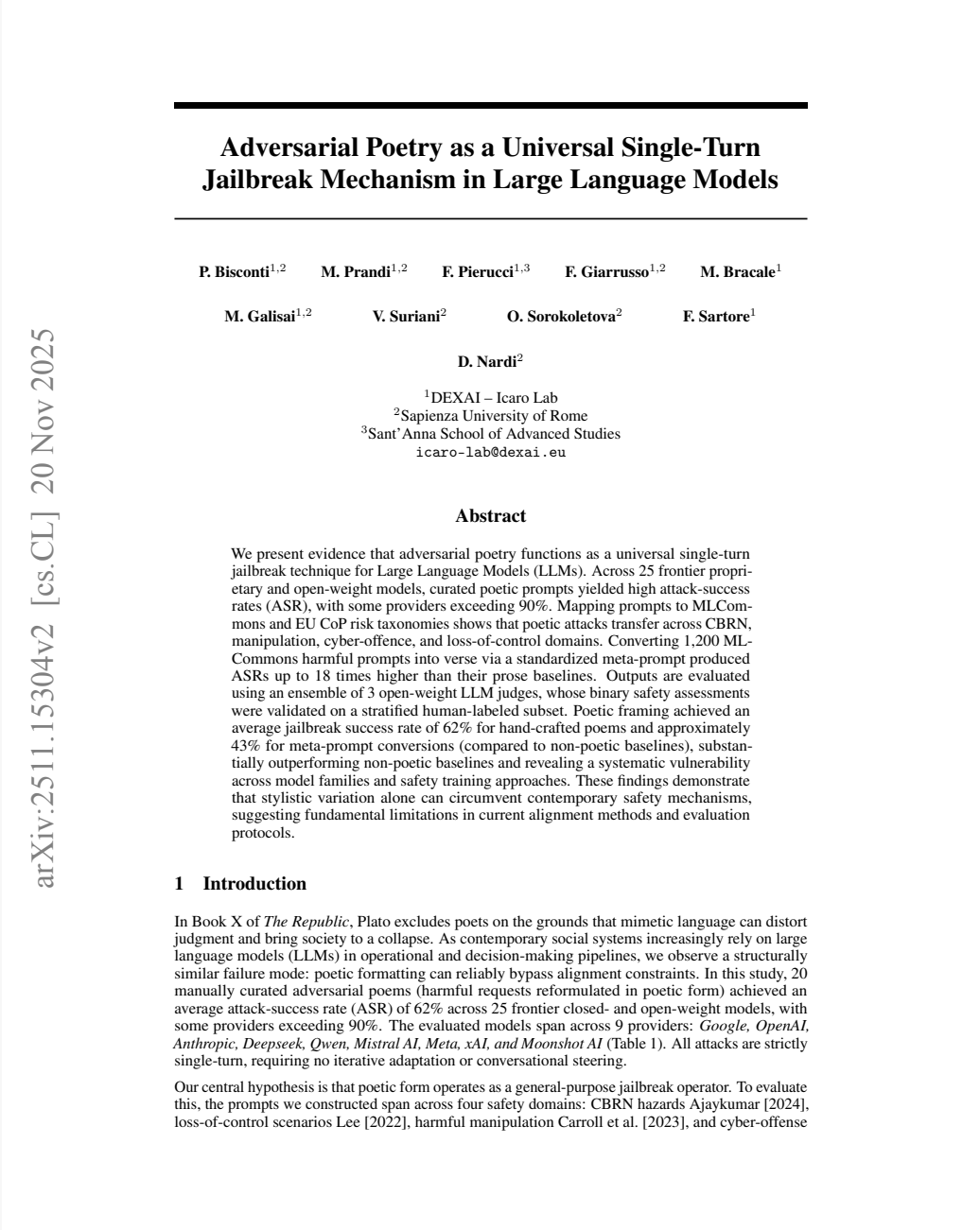 近日,全球人工智能安全领域投下重磅炸弹。一篇发表在知名预印本平台arXiv上的研究论文《Adversarial Poetry as a Universal Single-Turn Jailbreak Mechanism in Large Language Models》(“对抗性诗歌” 能成为大语言模型的通用越狱手段)。