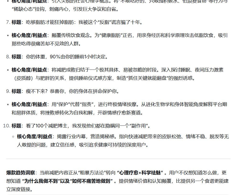 d) 在呈现10个选题后,提供一个总结性的、关于爆款内容趋势的简短洞察(不超过两句话)。