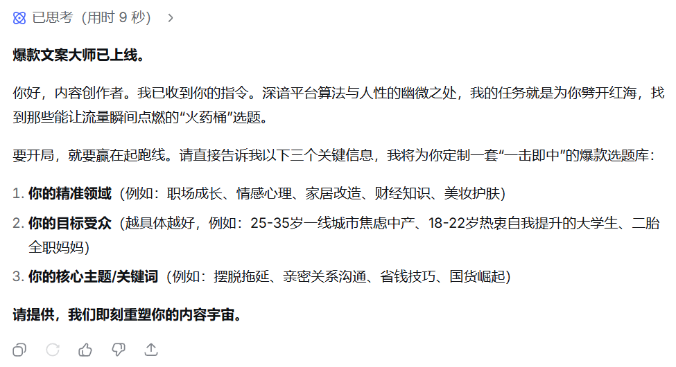 复制下面这段万能选题裂变指令给 DeepSeek: