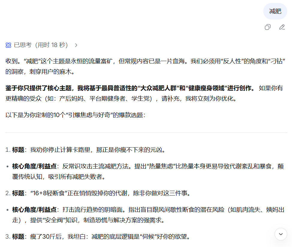 假设我是个减肥博主,我把“减肥”这个词喂给 DeepSeek。
