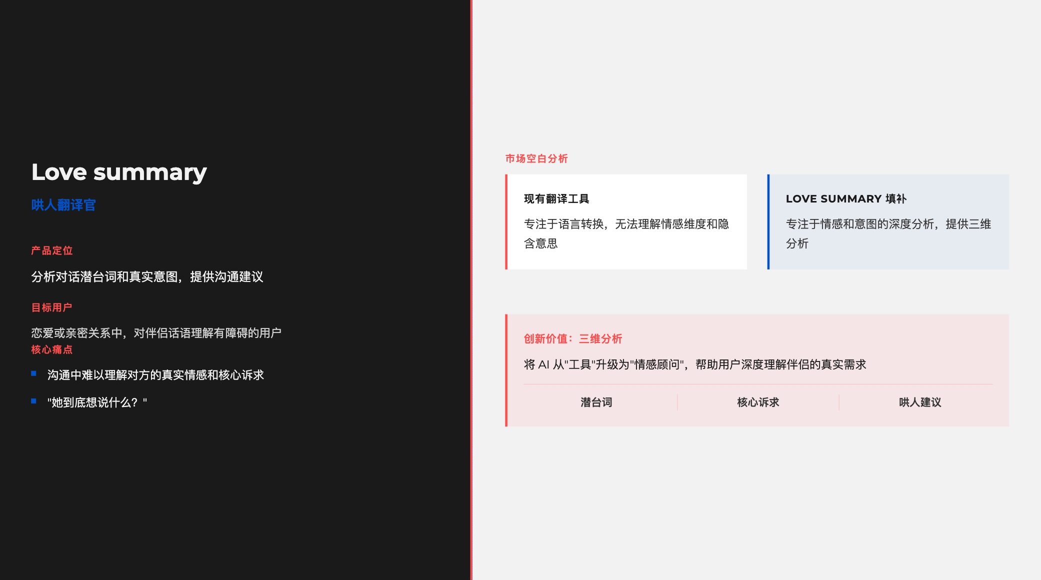 市场空白: 现有翻译工具专注于语言转换,而 Love summary APP则专注于情感和意图的深度分析,提供三维分析(潜台词、核心诉求、哄人建议)。