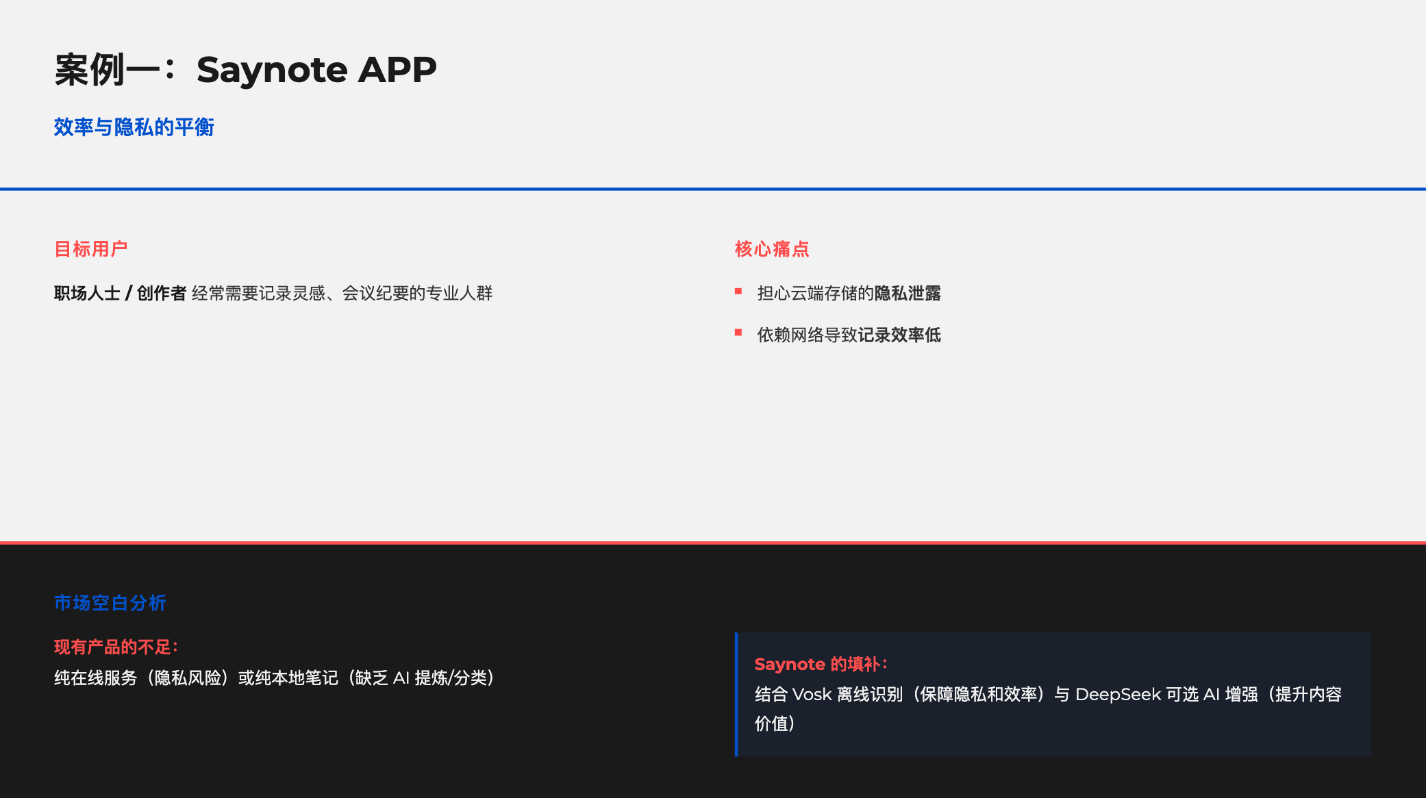 市场空白: 现有产品要么是纯在线服务(隐私风险),要么是纯本地笔记(缺乏 AI 提炼/分类),要么是商业化严重(各种增值服务夺人眼球),而围绕着这三个市场情况,Saynote APP结合了 Vosk 离线识别(保障隐私和效率)与 DeepSeek 可选 AI 增强(提升内容价值及低成本)。