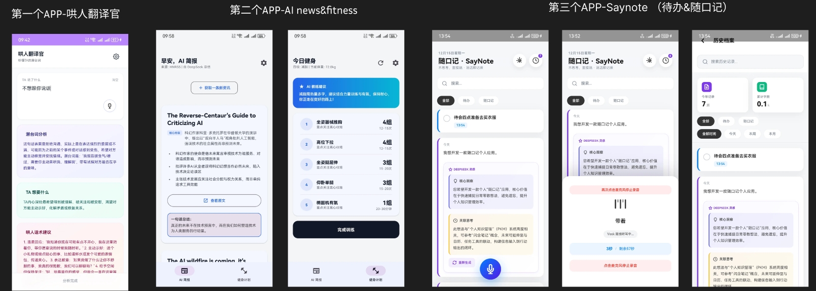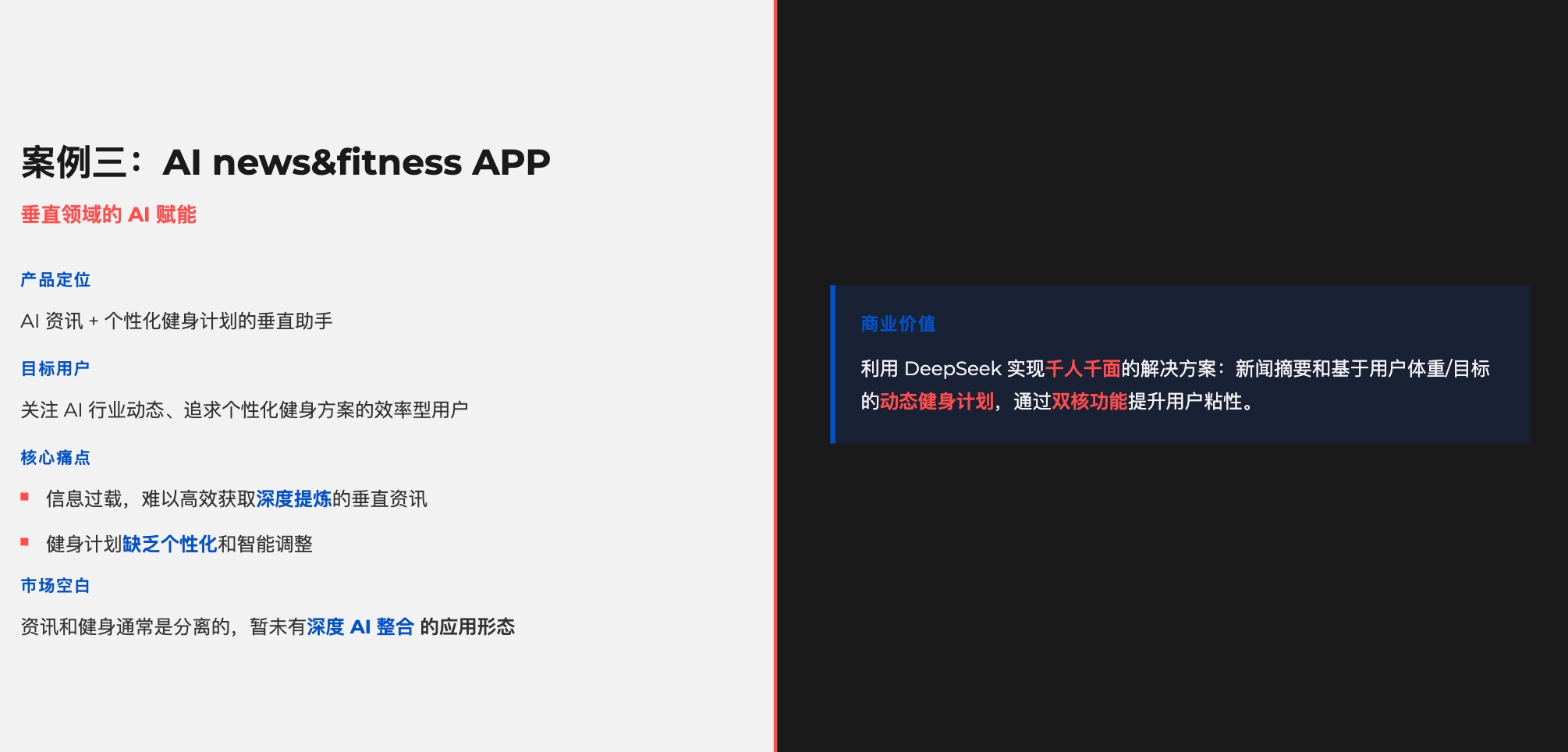 用户痛点:关注 AI 行业动态的用户面临信息过载,难以高效获取深度提炼的垂直资讯;健身用户则缺乏个性化和智能调整的计划。