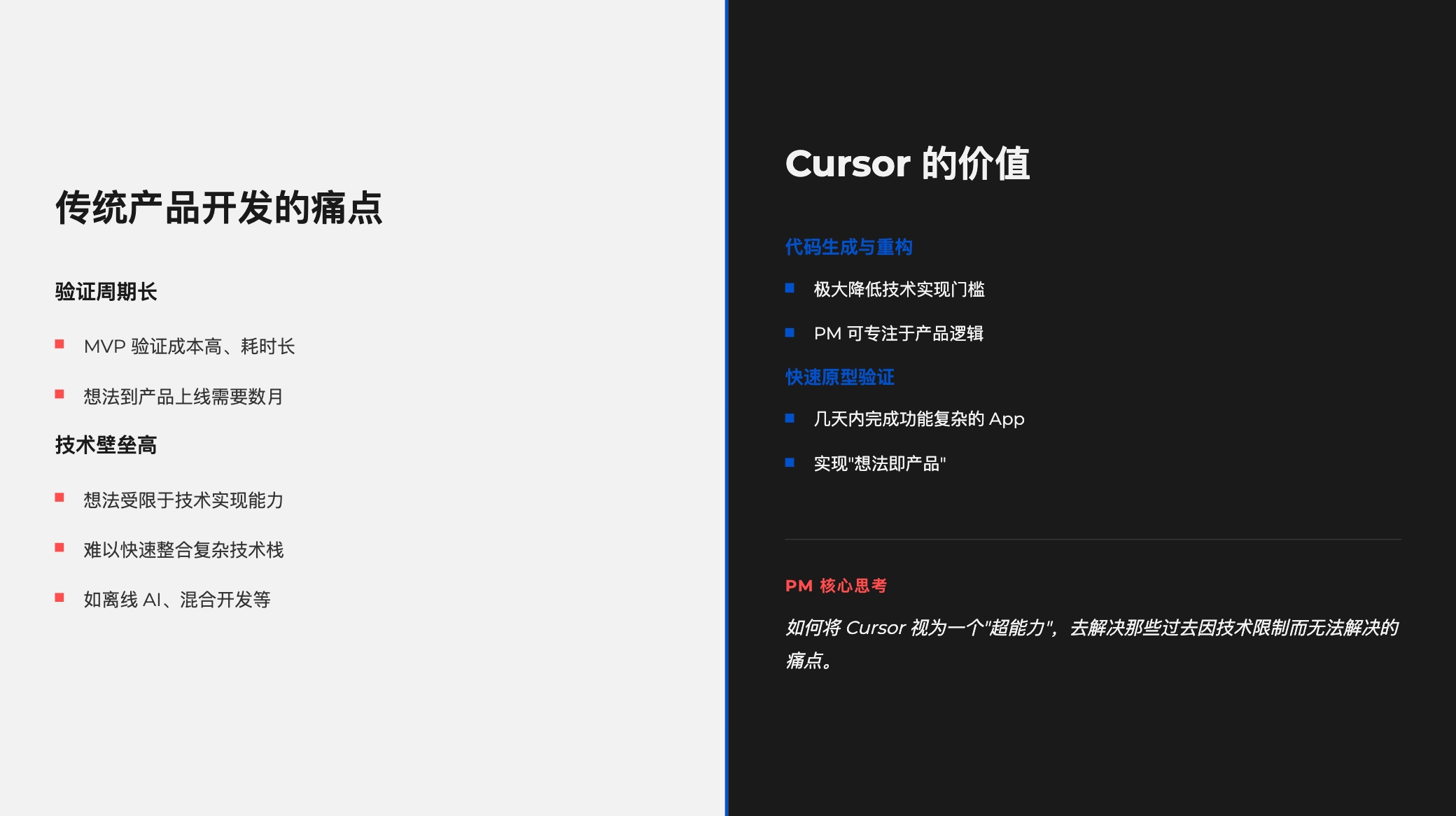 然而以 Cursor 为代表的 AI 辅助开发工具,正在加速 PM 的构建新Idea的进程。个人通过Cursor实操构建了三个MVP的APP,最大的感触就是产品经理借助AI 工具,可以更加深入洞察用户、解决传统市场无法满足的痛点,真正帮助产品经理落地他们的想法。