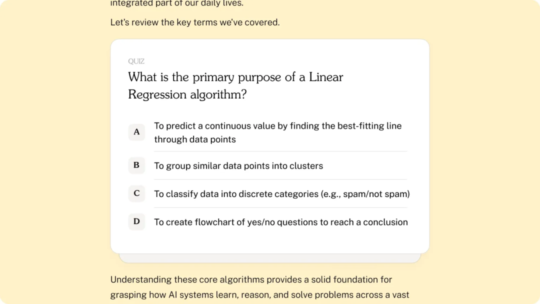 在新版本中,Oboe 做了一个关键改变:应用会先理解你的学习目标,然后基于目标生成章节,帮助你学习这些主题。更重要的是,用户会看到测验等其他模态无缝地出现在课程材料中。对于某些课程,Oboe 还会生成记忆卡片,帮助你轻松记住课程内容。这种设计背后的思考是:不要让用户自己决定用什么格式学习,而是让系统根据内容和学习目标来决定最佳的呈现方式。