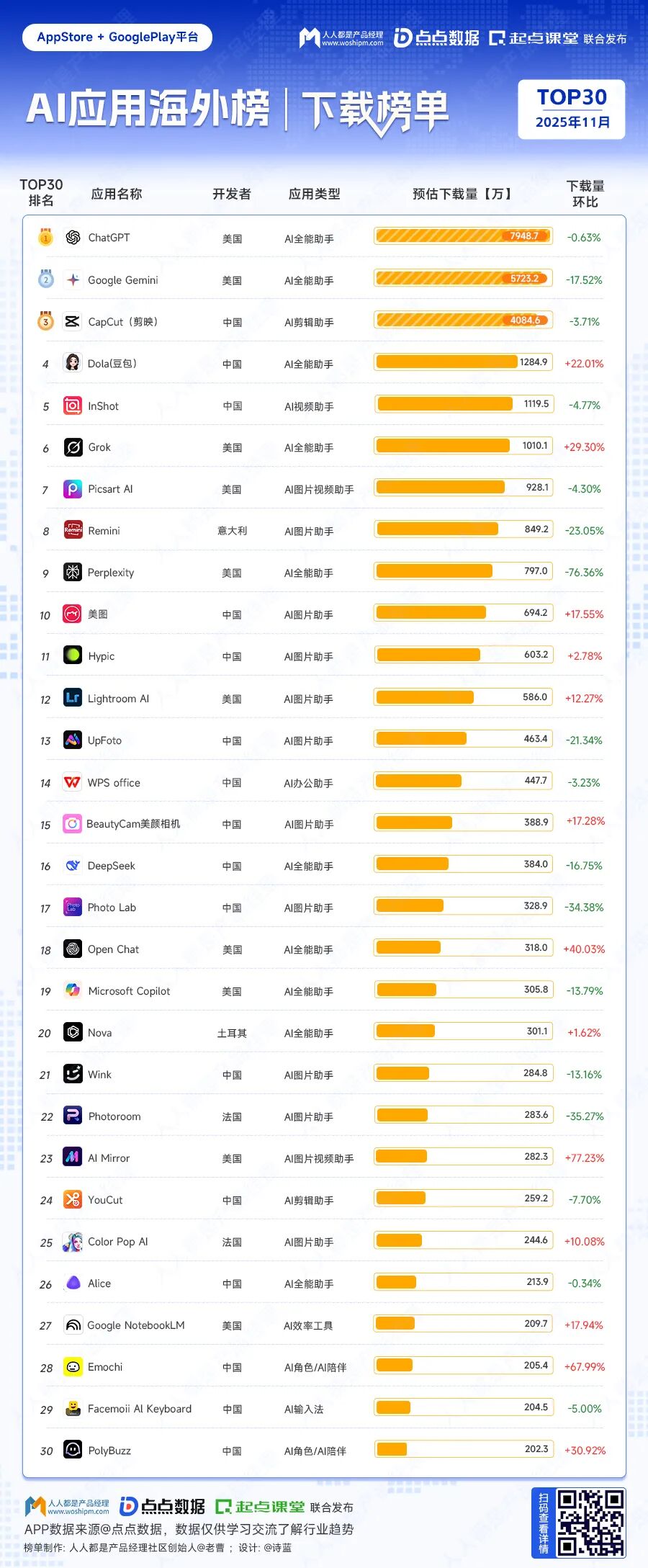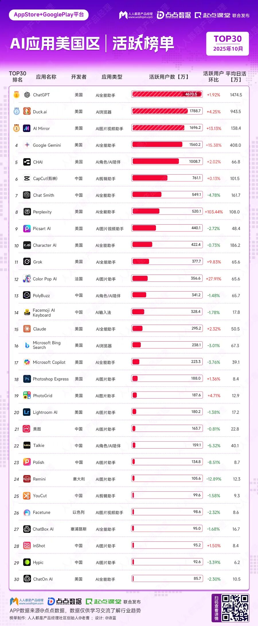 回归正题,最近整理了最新的海外、美国及中国区AI应用数据(含收入、下载、活跃榜),对着这几张密密麻麻的表格研究了一整晚,我看到了几个让人背脊发凉,却又无比真实的行业真相。(完整榜单放在了文末⬇️)