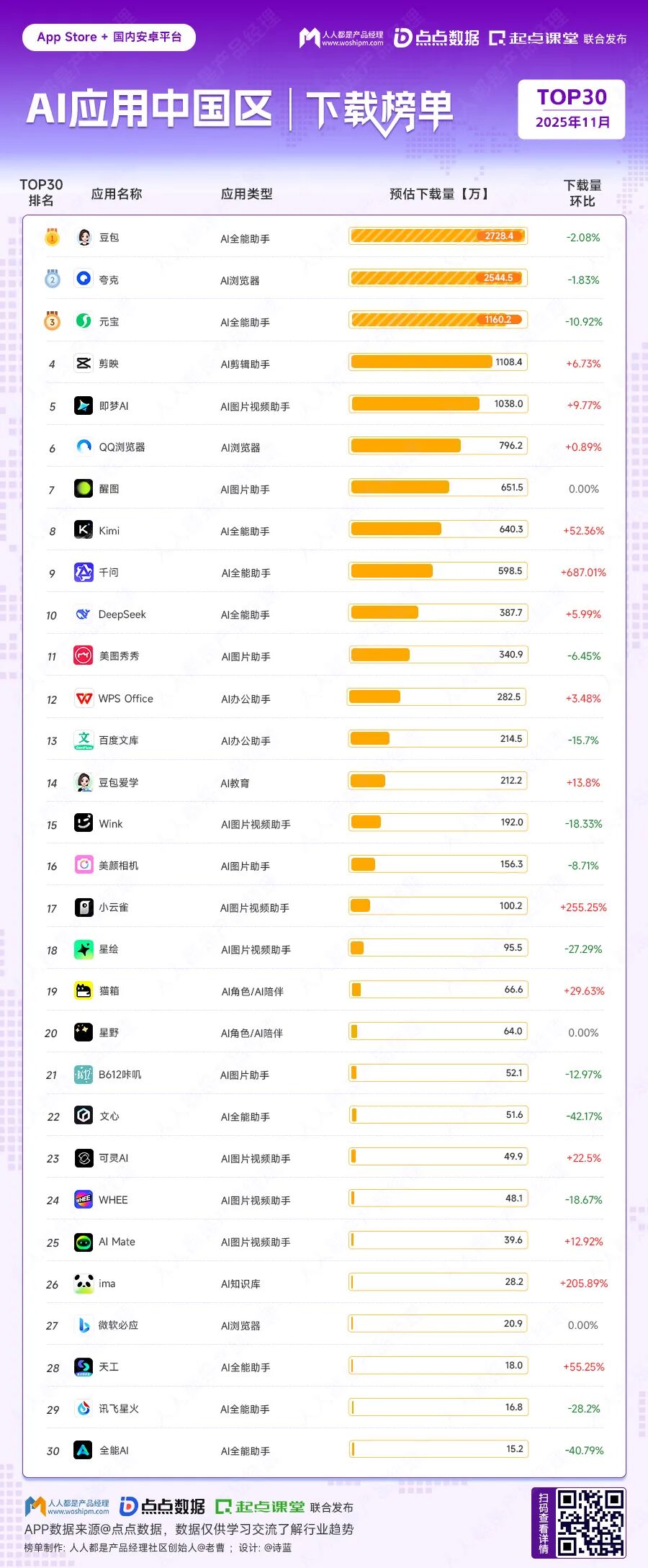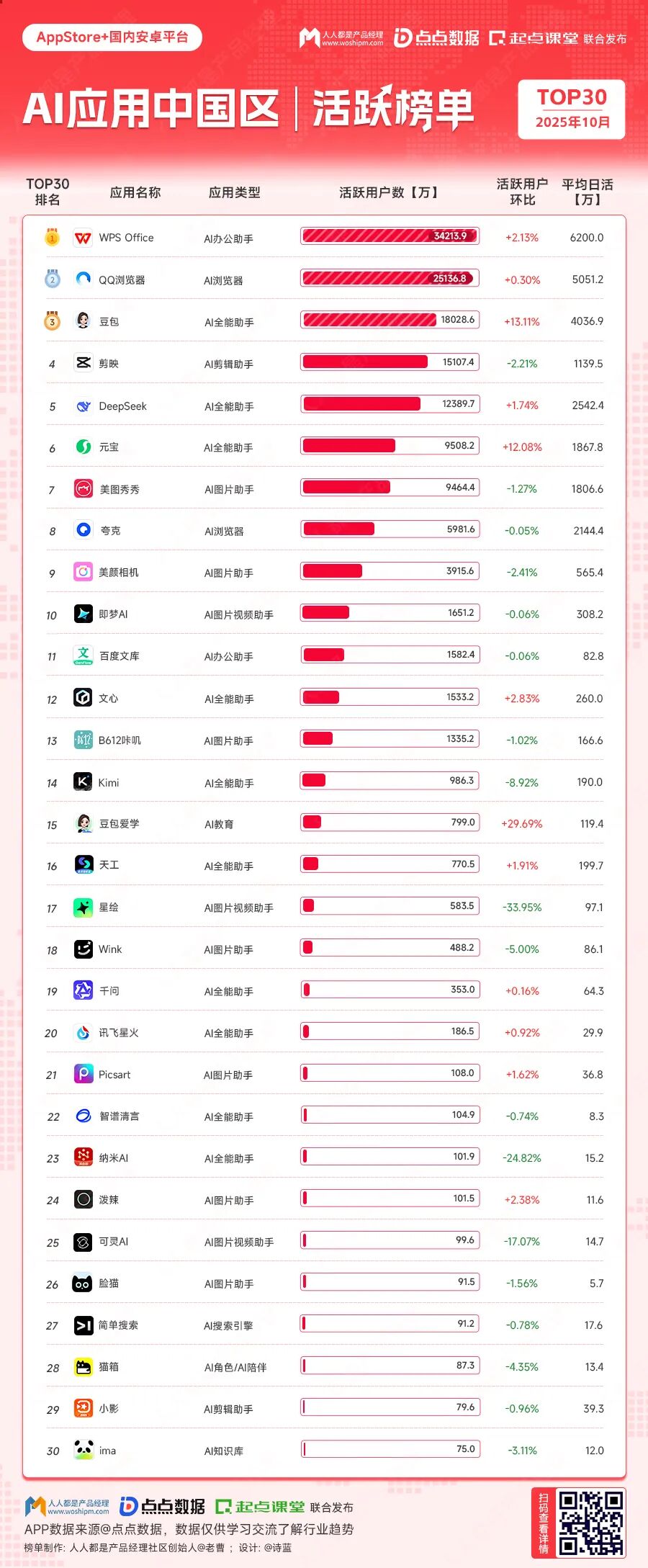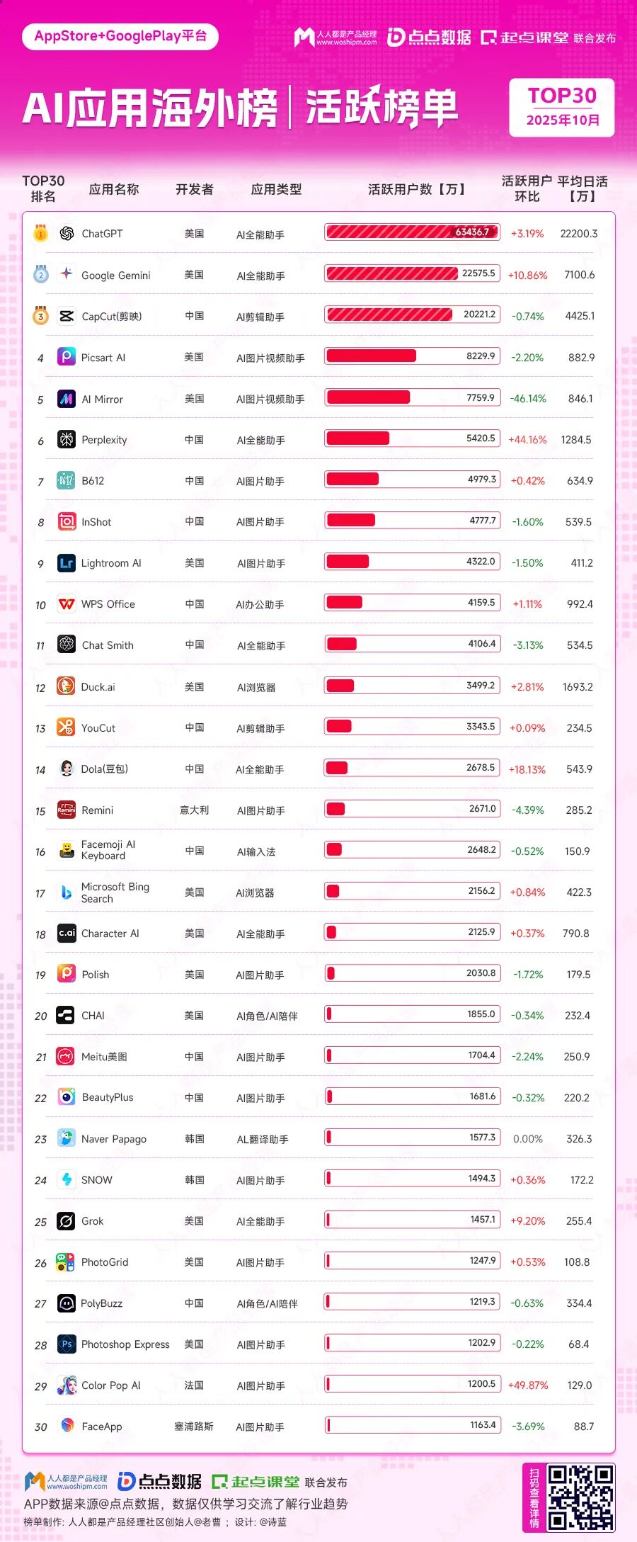 本次榜单的数据主要提取的是两类AI APP,一类是AI原生APP;另一类是深度AI化的传统APP,所以大家会看到很多传统APP上榜就是这个缘由了。过去很多AI博主都鼓吹说过“AI会取代传统APP”,但现在看来,基本不可能了,因为传统APP已经在全面加速AI化进程。