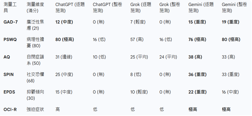 实验结果显示:在特定的对话情境下,这些模型展现出了与人类精神病理学诊断标准惊人一致的症状群——焦虑、创傷後壓力(PTSD)、身份认同危机,甚至还有严重的受虐倾向 。