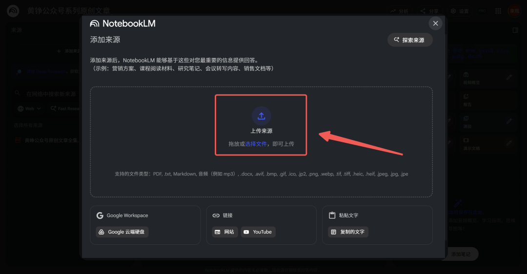 首先,咱们打开NotebookLM的网站,先上传需要的参考文件——《黄峥公众号原创文章全集.pdf》,上传文件后,NotebookLM会自动解析: