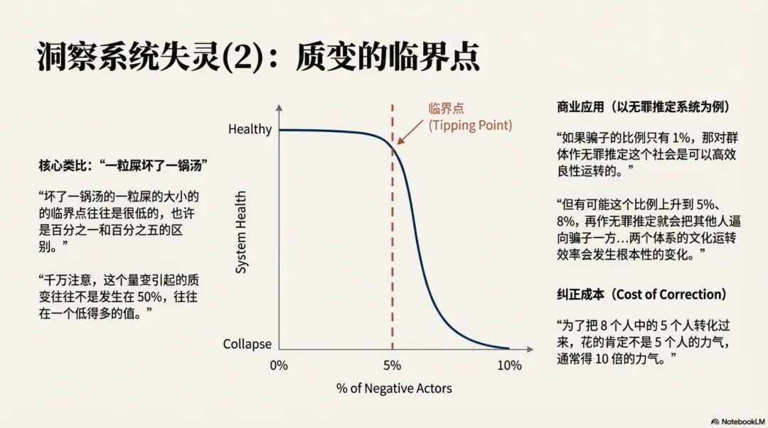 它抓住了黄峥原文中关于“临界点”的论述——一粒屎坏了一锅汤,劣质比例在2%到5%之间,而且,幻灯片右侧对商业应用、纠正成本的引用和总结,也是非常的到位。