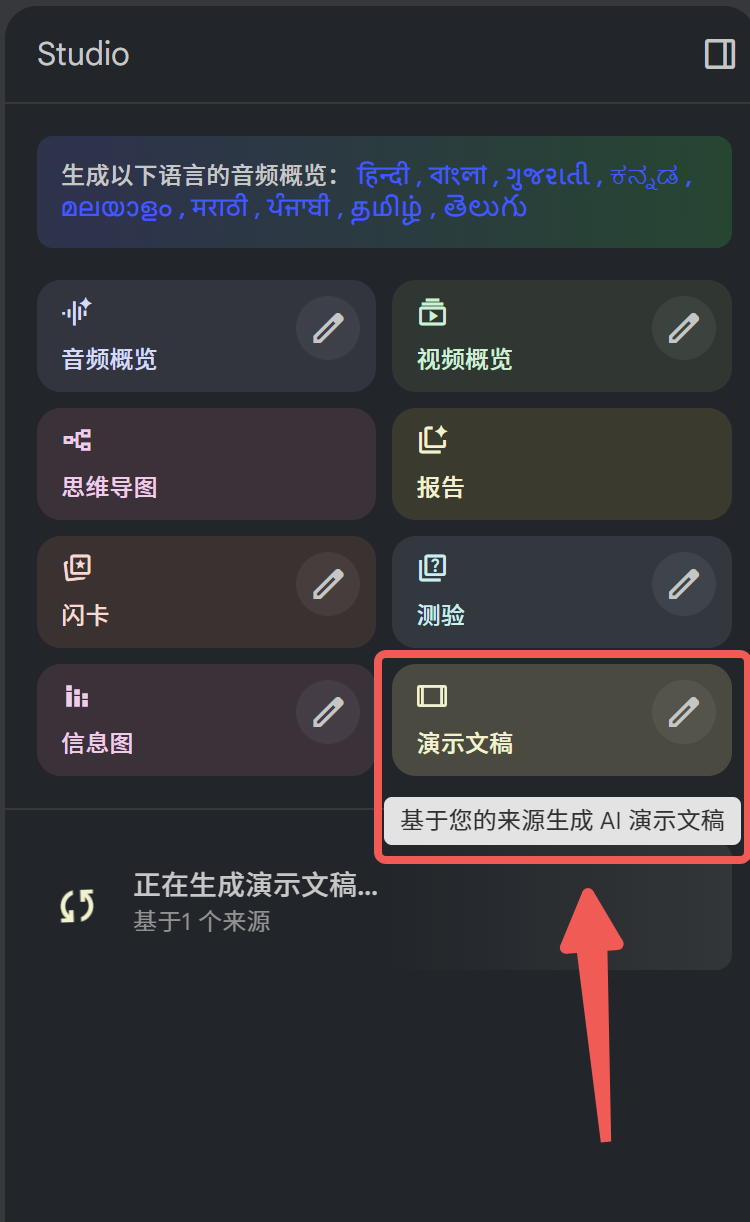 解析完成后,咱们在右侧可以看到「演示文稿」的生成按钮,点击下,然后静待生成。