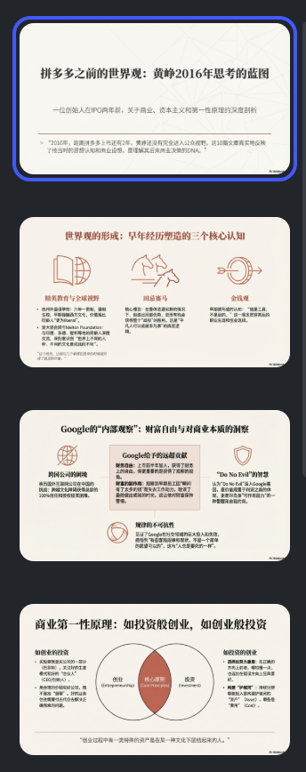 我用谷歌NotebookLM,把黄铮的商业思考,一键转成了PPT!