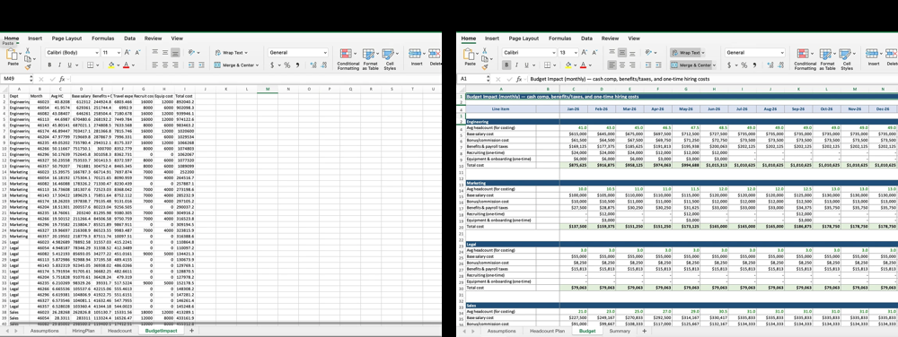 下图显示了GPT-5.1(左)与GPT-5.2(右)在自动创建“人力规划模型”表格时的对比:GPT-5.2生成的表格布局更专业、细节更完善,错误率更低。