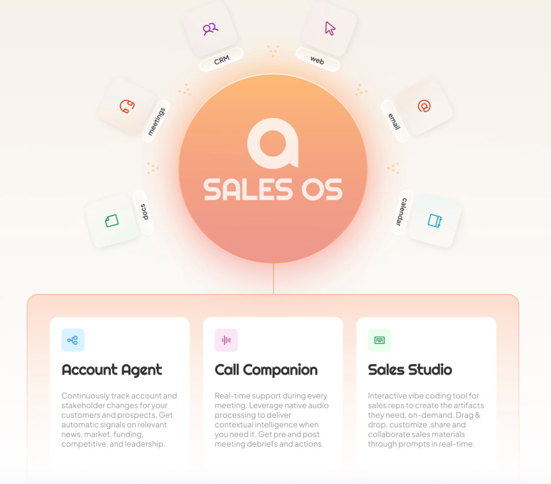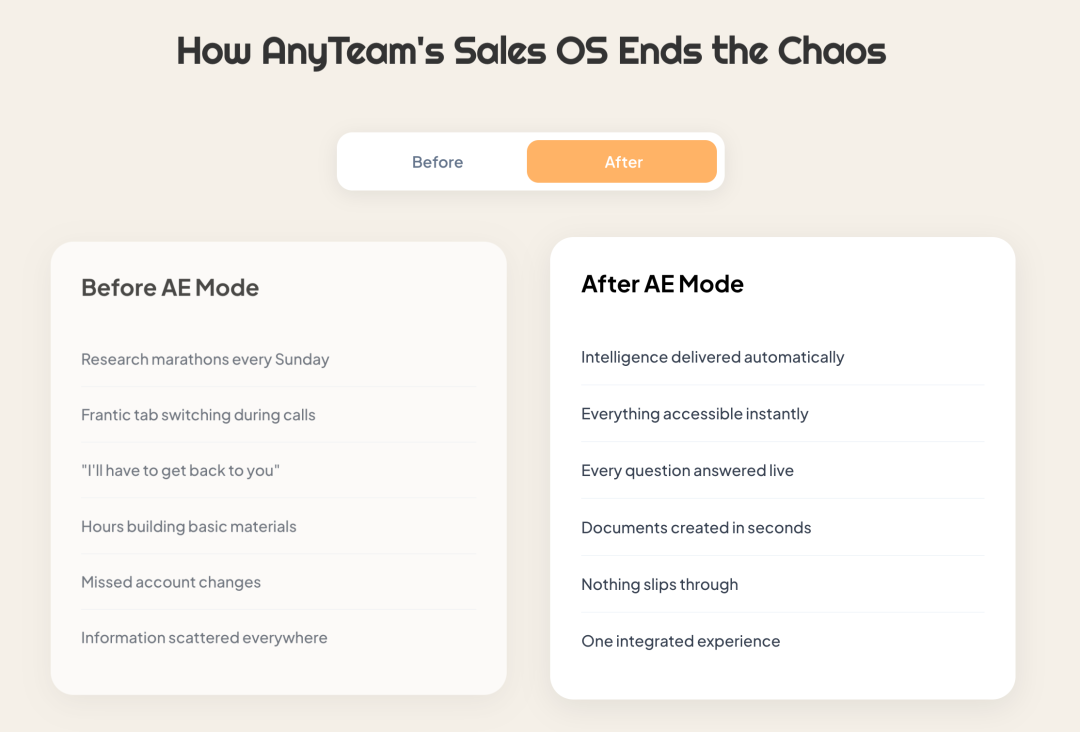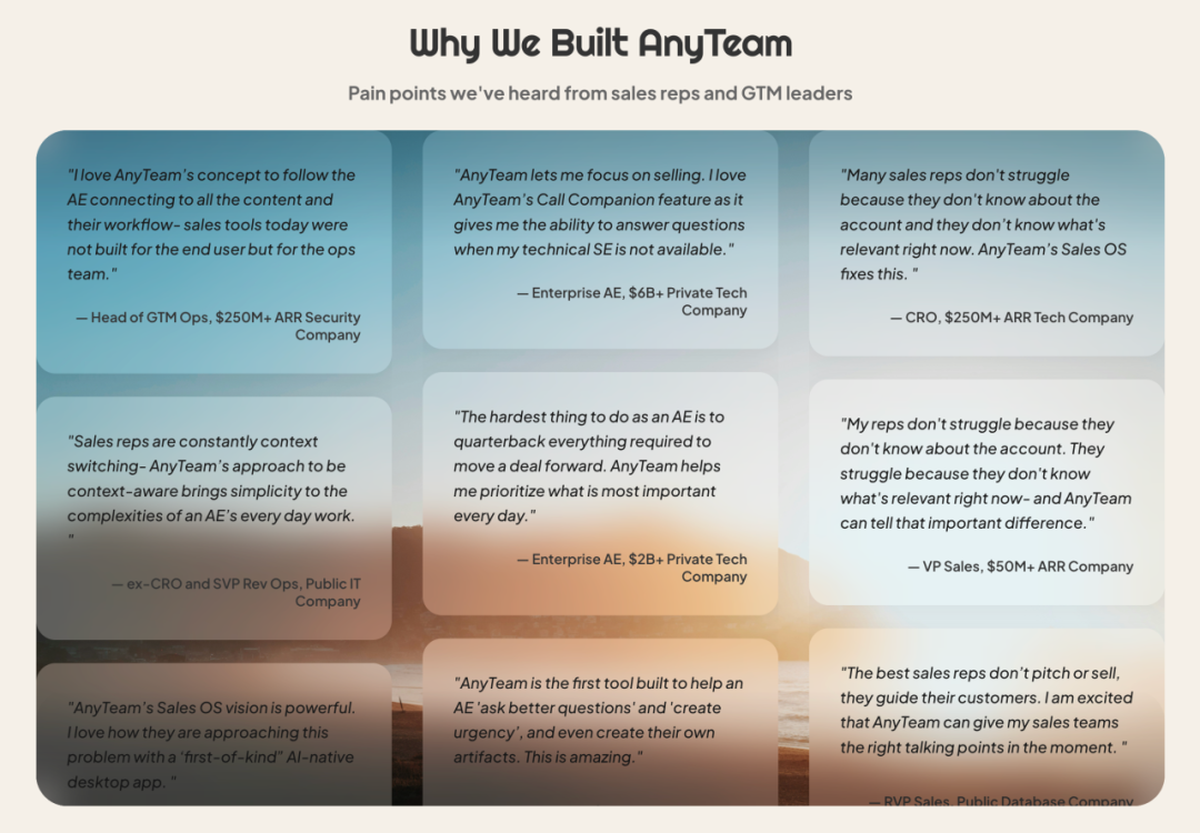 AnyTeam 的方法完全不同。他们没有创造另一个销售工具,而是重新定义了销售人员的工作方式。他们打造的是一个 AI 原生的销售操作系统,就像 Windows 或 macOS 是电脑的操作系统一样,AnyTeam 要成为销售专业人士的工作操作系统。这个操作系统始终在线,能感知上下文,并在每次客户互动的前、中、后主动提供指导。