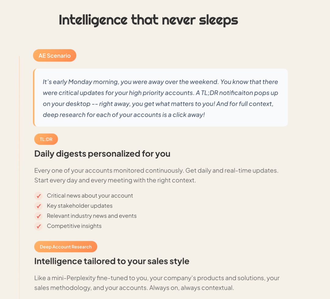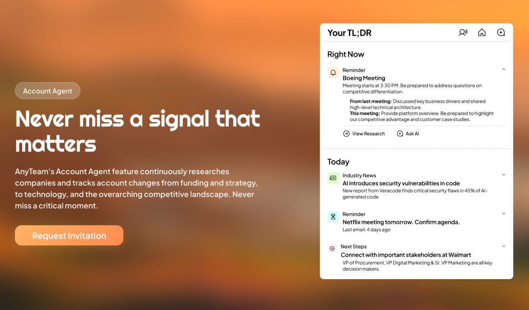 AnyTeam 采取的是完全相反的方法。他们的 AI 原生桌面应用是销售代表的 AI 副手,始终在线、感知上下文、主动提供帮助。它在用户的设备上运行,连接日历、邮件、CRM、Slack 和内部工具,创建一个单一的智能销售操作系统。这就像是销售人员的终极私人助理,把几小时的繁琐工作压缩到几分钟,让销售人员能够在每次会议中都表现得敏锐、信息充分并准备好赢得客户。