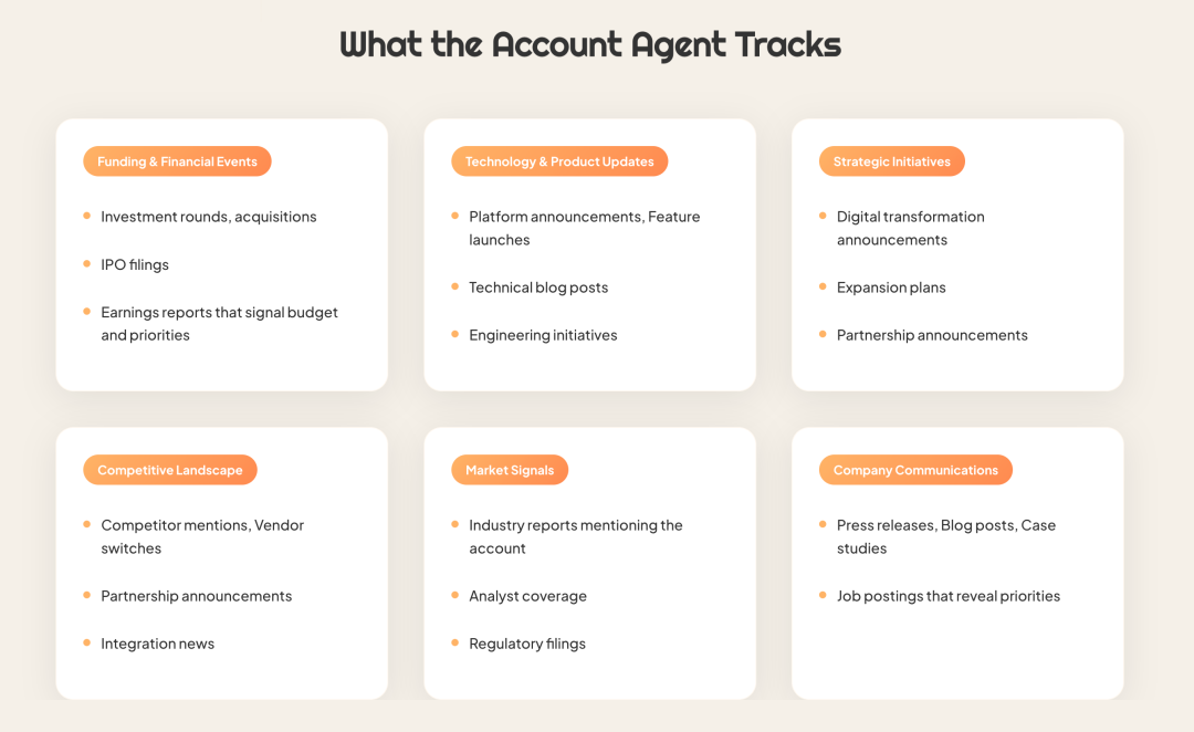 AnyTeam 的产品架构由三个核心支柱组成,每一个都针对销售流程中的关键痛点。第一个是 Account Agent(客户 Agent),它能为每个潜在客户和现有客户提供全面的洞察。过去销售人员需要花 3-4 个小时在各种网站、LinkedIn、新闻网站和 CRM 之间来回切换做客户调研,现在 Account Agent 能把这个过程压缩到 3-5 分钟。更重要的是,这个 Agent 会持续监控客户动态,当你的潜在客户公司宣布新一轮融资或高管变动时,你会立即知道。不需要手动追踪,信息会自动推送给你。