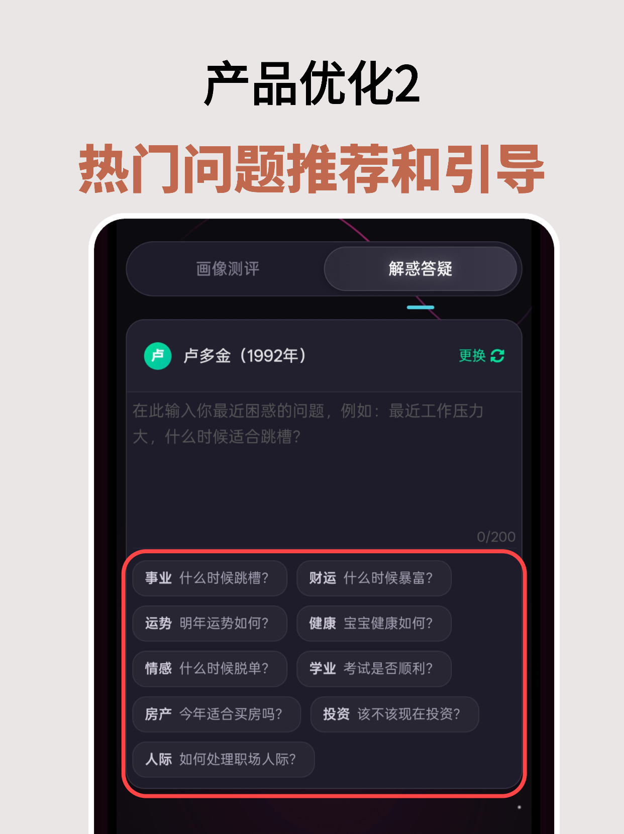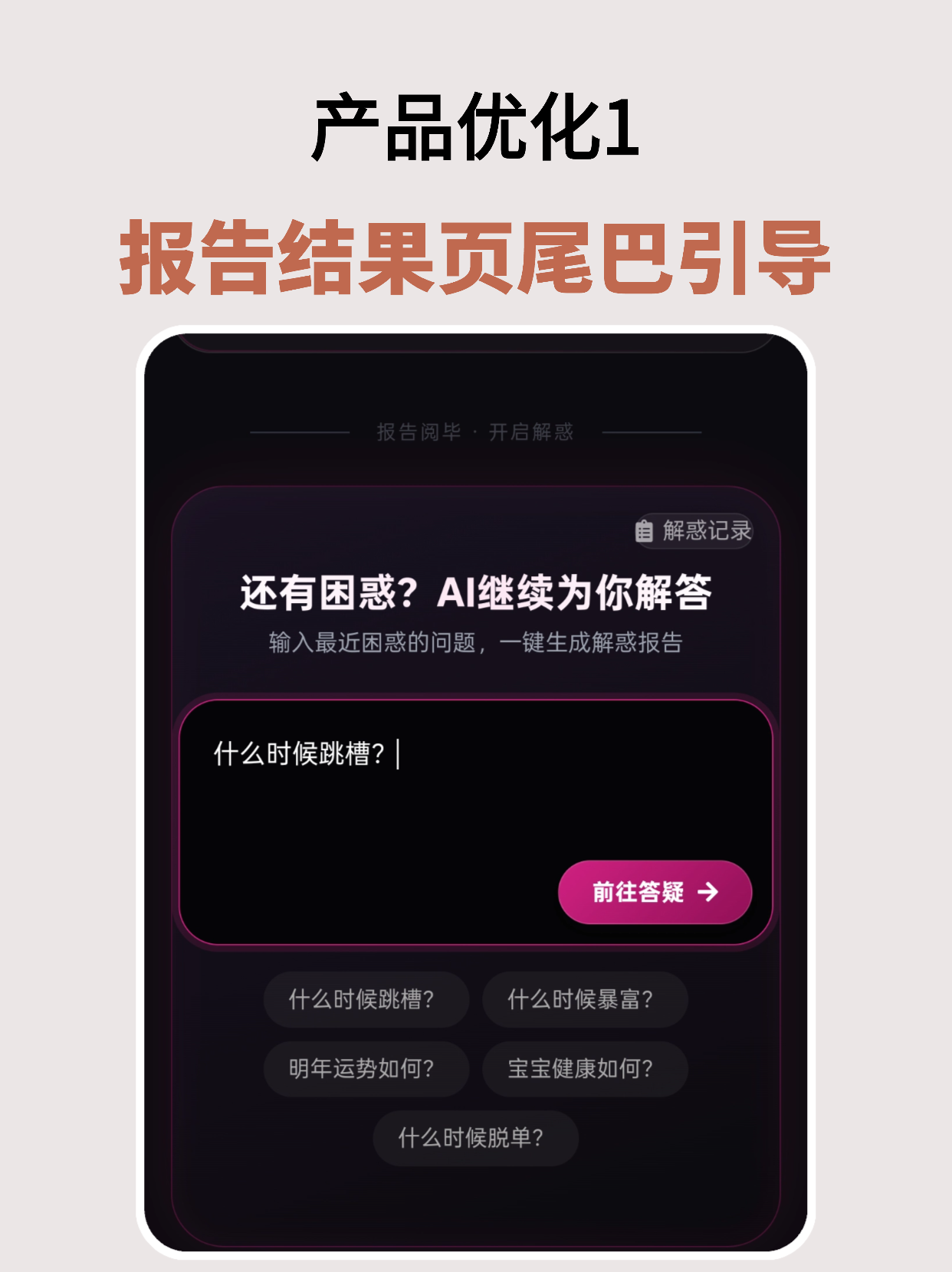 接着,在首页解惑答疑页面,以及前面报告页尾部引导里面,都增加解惑场景的问题推荐,比如很多人喜欢问事业(什么时候跳槽),用户点击文字引导可以快速输入到输入框中,减少输入的成本;