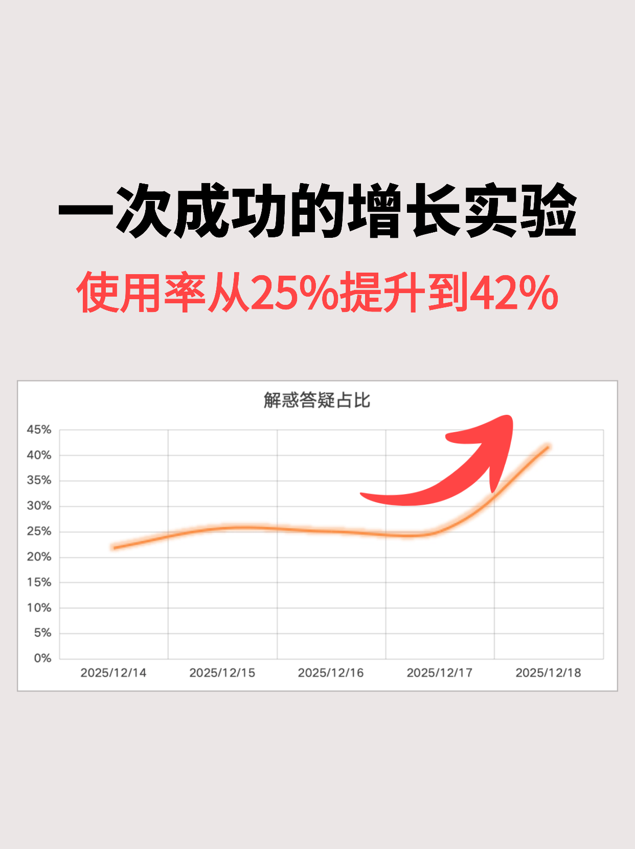 本次优化直接使得产品“解惑答疑”功能模块的使用率从25%提升到42%,效果提升非常显著,算是一次比较不错的增长案例;