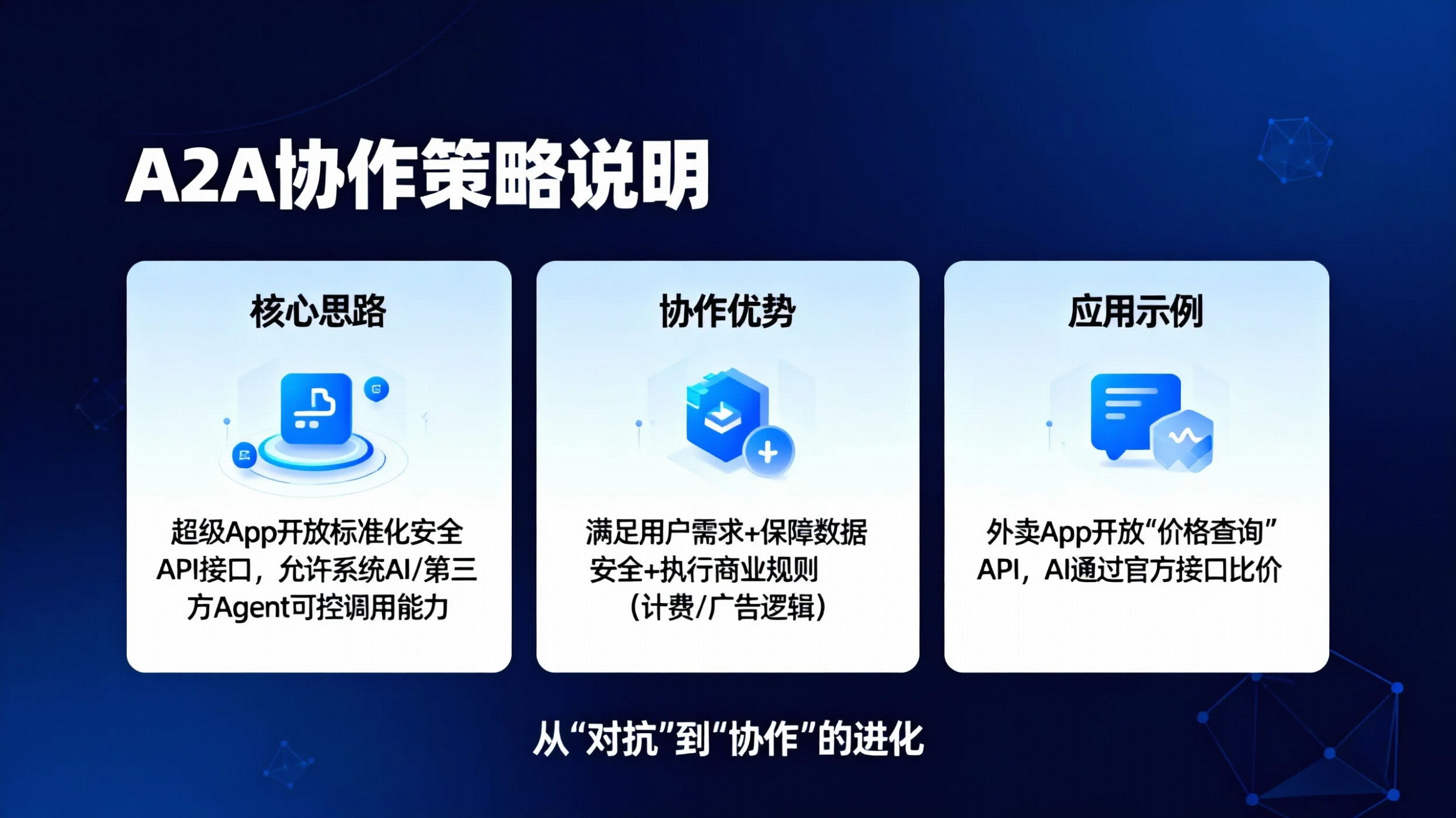 所以,更成熟的策略,可能是“有条件地合作”。这里就要提到OPPO提出的“Agent to Agent(A2A)”思路了。这个思路的核心是,超级App不再把大门完全关死,而是开放一些标准化的、安全的API接口,让系统AI或者第三方Agent,能以一种可控、可审计、可追责的方式,来调用它的能力。
