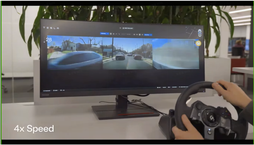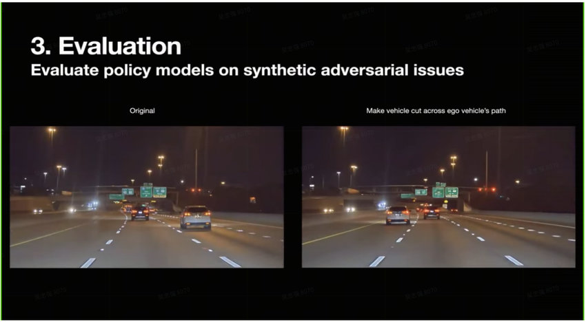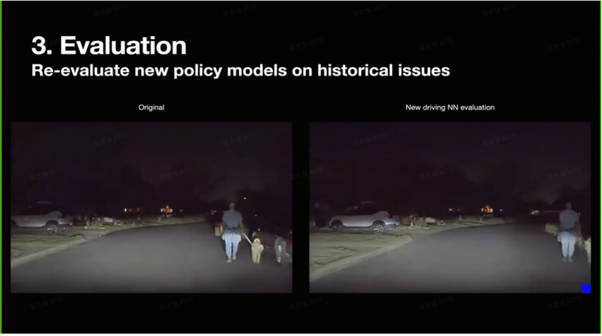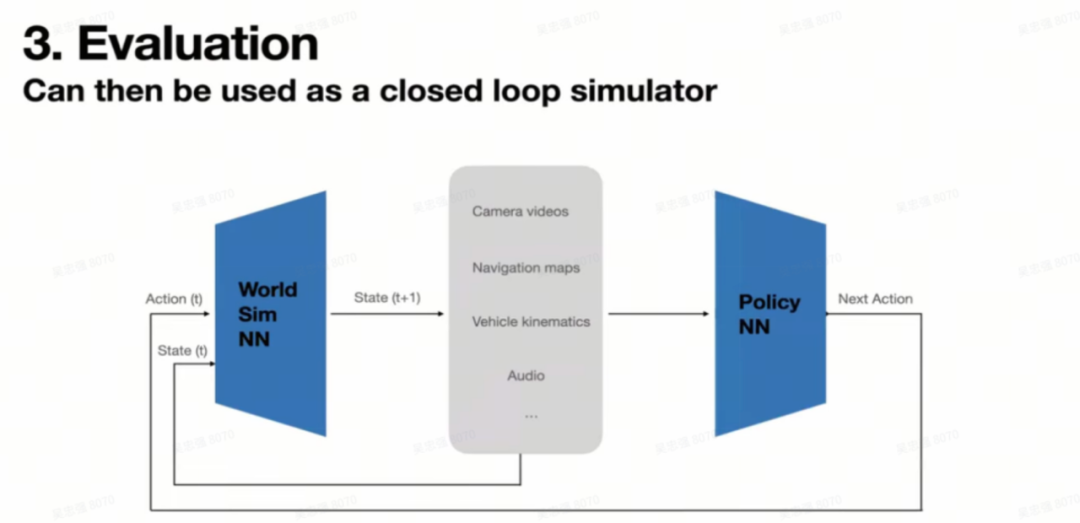 Tesla完善的评测体系中的核心就是基于神经网络的闭环仿真系统。这个仿真系统可以通过收集⼤量廉价的离线<状态-动作>数据对进行训练。
