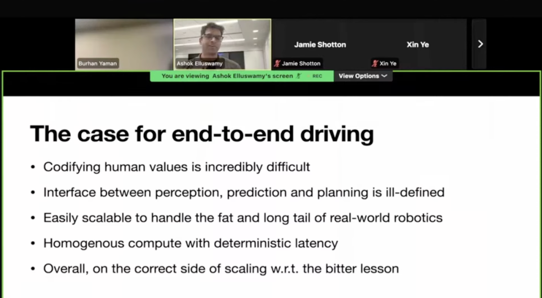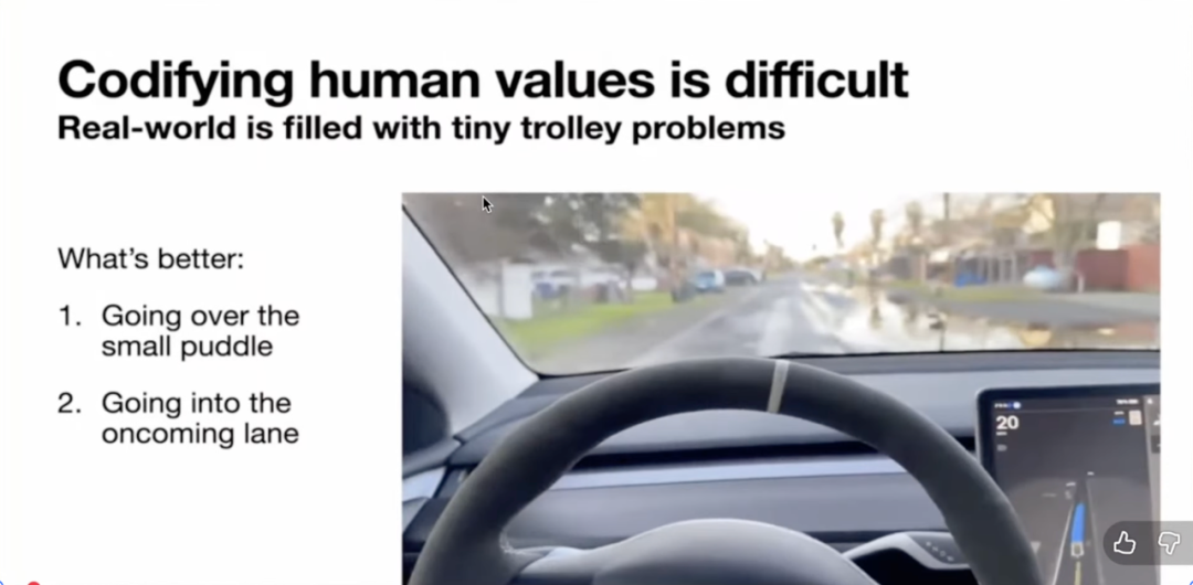 驾驶本质上是无数个微观“电车难题”的集合。Ashok举例:面对积水车道,是“压线绕行”还是“车道内涉水”?这种涉及安全与效率权衡的微妙价值判断,传统Rule-based代码根本无法完美定义。端到端的核心优势在于,它能从海量人类老司机的驾驶数据中,隐式学习到这种复杂的价值权衡(Value Judgement),而非依赖工程师写死在if-else里 。