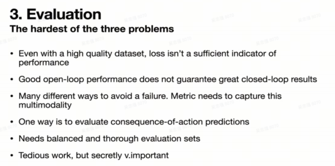 Ashok将E2E的工程落地拆解为三个核心难题:维度灾难(怎么训)、可解释性(怎么信)、以及评测(怎么测)。