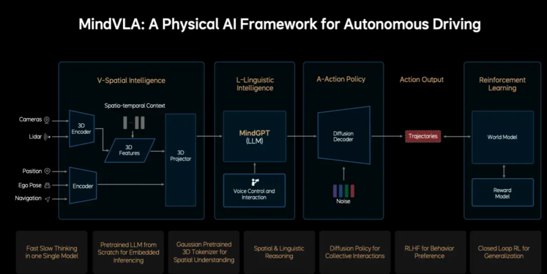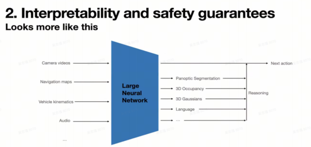 简单的端到端系统作为“黑箱”,在问题分析、行为解释和安全验证方面存在隐患。针对“黑盒”质疑,Ashok展示了Tesla目前的解法:VLA(Vision-Language-Action)+ 3D Gaussian。Tesla的E2E系统并非完全黑盒,而是一个具备中间监督信号的复杂网络。