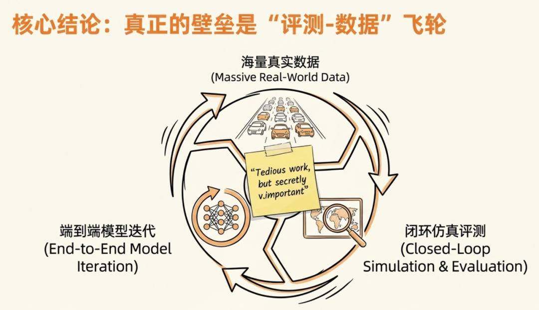 真正壁垒:不仅在于端到端模型架构本身的领先性,更在于“海量真实数据 -> 闭环仿真评测 -> E2E模型迭代”这一飞轮的运转效率。