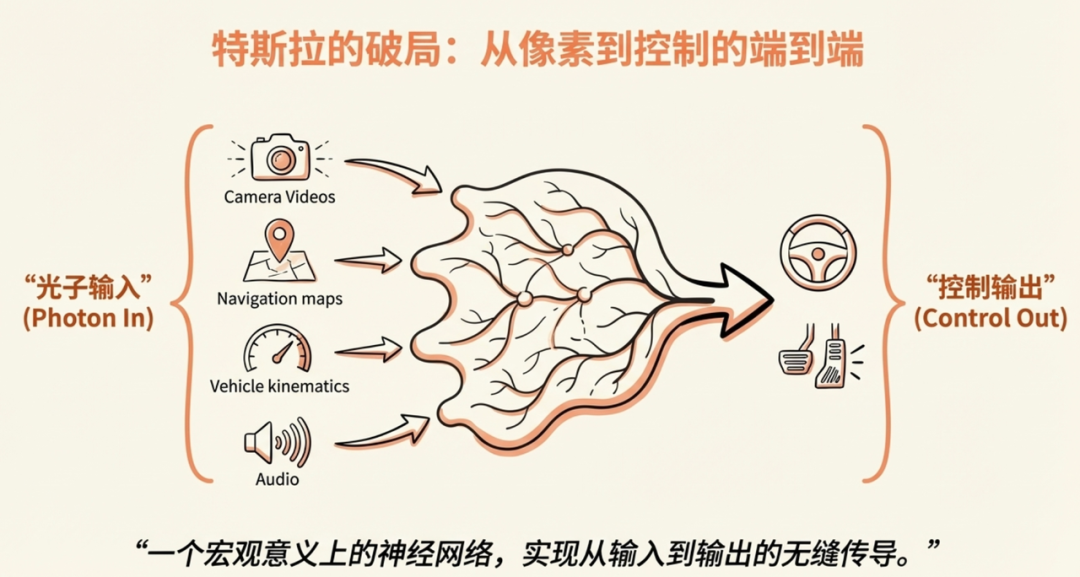 从V12起,Tesla彻底转向“Photon In, Control Out”架构,这不仅是技术栈的重构,而是对传统级联(Modular)架构弊端的彻底清算。该架构的核心价值在于利用Scaling Law,通过移除规则代码减少了中间规则处理环节,使得模型训练的梯度能够从输出端无缝反向传播至感知端,从而实现模型各部分的整体协同优化。