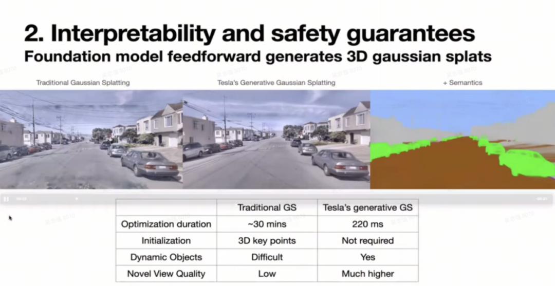 Tesla采用生成式3D Gaussian Splatting(3DGS)进行场景重建。其优势在于生成效率极高(220ms)、无需预设关键点且支持动态物体。