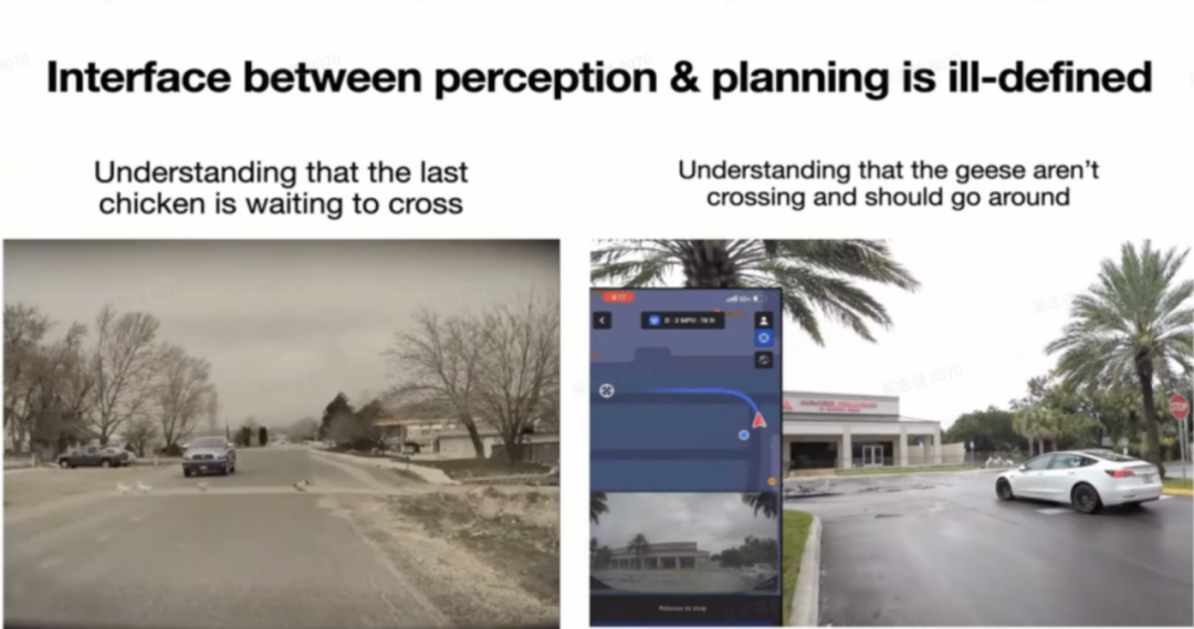 传统架构最大的痛点是感知与规控间的“接口瓶颈”。Ashok展示的“鸡与鹅”典型案例:感知模块输出的Bounding Box丢失了关键语义——“鸡在过马路(需等待)”与“鹅在路边发呆(可绕行)”的区别。传统接口导致的信息丢失是不可逆的,而端到端通过高维特征流(Latent Features)传递,保留了环境的完整语义,让决策模块能获取无损的“上帝视角”。