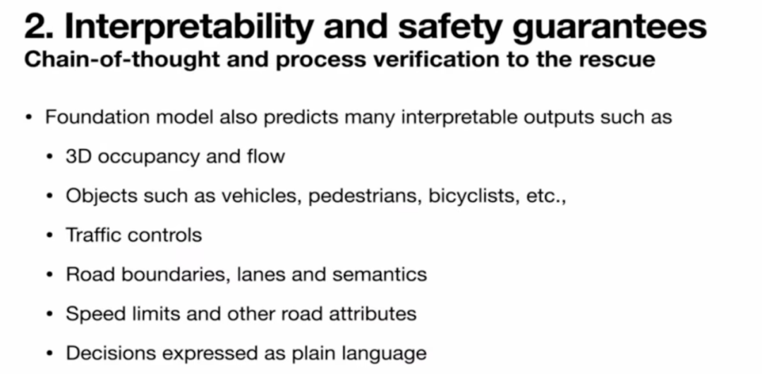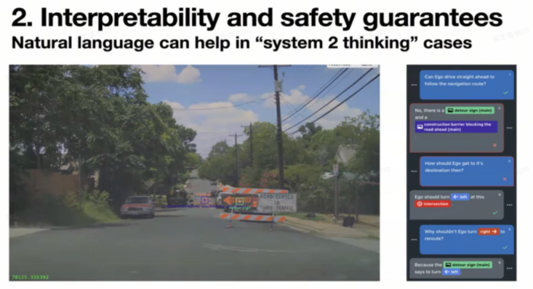Ashok给出了System 2慢思考应对施工长尾场景的例子:引入了大语言模型(LLM)的思维链(CoT)能力。在遇到“道路封闭”等长尾场景时,模型不仅输出动作,还能生成自然语言解释(“识别到封路标识 -> 推理出无法直行 -> 决定左转绕行”)。这种逻辑推理能力的显性化,是建立人机信任的关键。