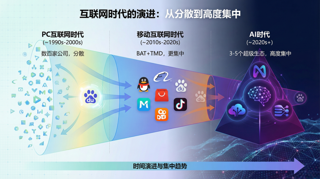PC互联网时代,中国还有几百家有影响力的互联网公司。移动互联网时代,逐渐集中到BAT+TMD。现在到了AI时代,可能最终只会剩下3-5个超级生态。