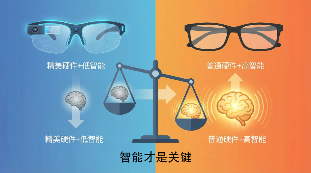 举个例子,当我需要写代码时,我宁可用界面相对简陋的Claude,也不会选择界面更友好但智能水平稍逊的其他工具。为什么?因为Claude能更准确地理解我的需求,给出更高质量的代码。同样的道理,如果市场上出现两款AI眼镜,一款硬件做工精良但AI反应迟钝,另一款硬件普通但AI极其聪明,我毫不犹豫会选择后者。