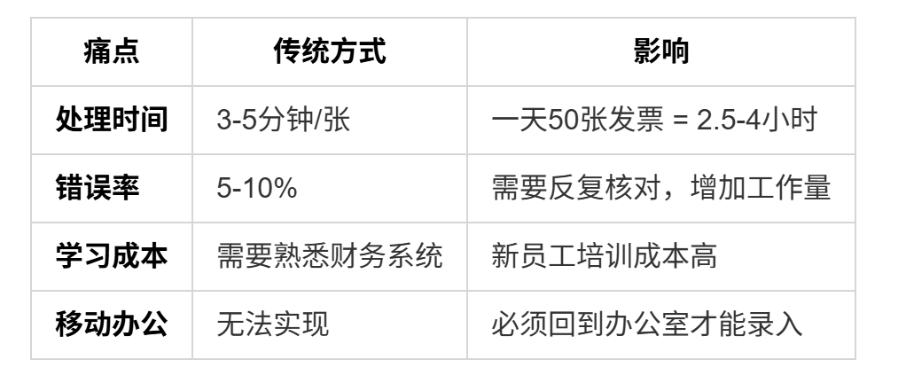 - 效率低下:一张发票3-5分钟,一天几十张就是数小时
