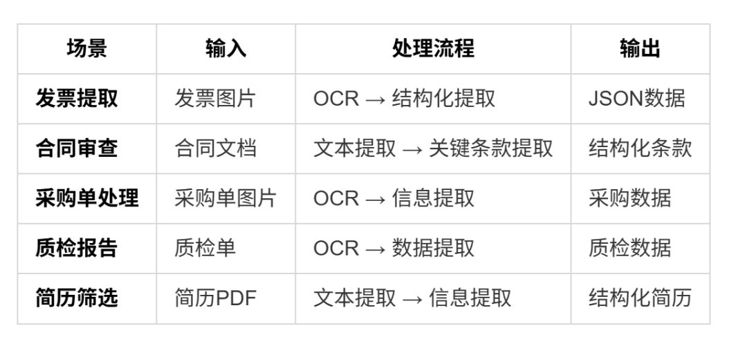 通用公式:文档/图片 → OCR/文本提取 → 大模型结构化提取 → 数据校验 → 结构化输出