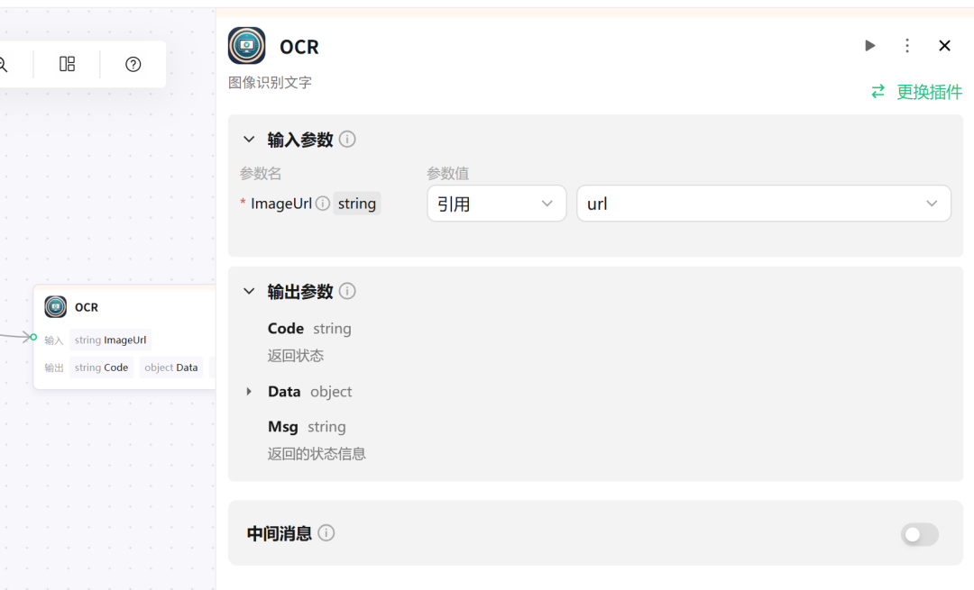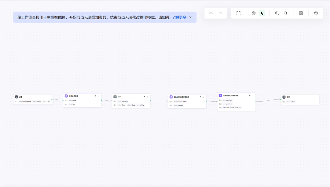 智能体 →提取上传链接→ OCR节点→提取OCR结构参数 → LLM格式化节点 → 输出